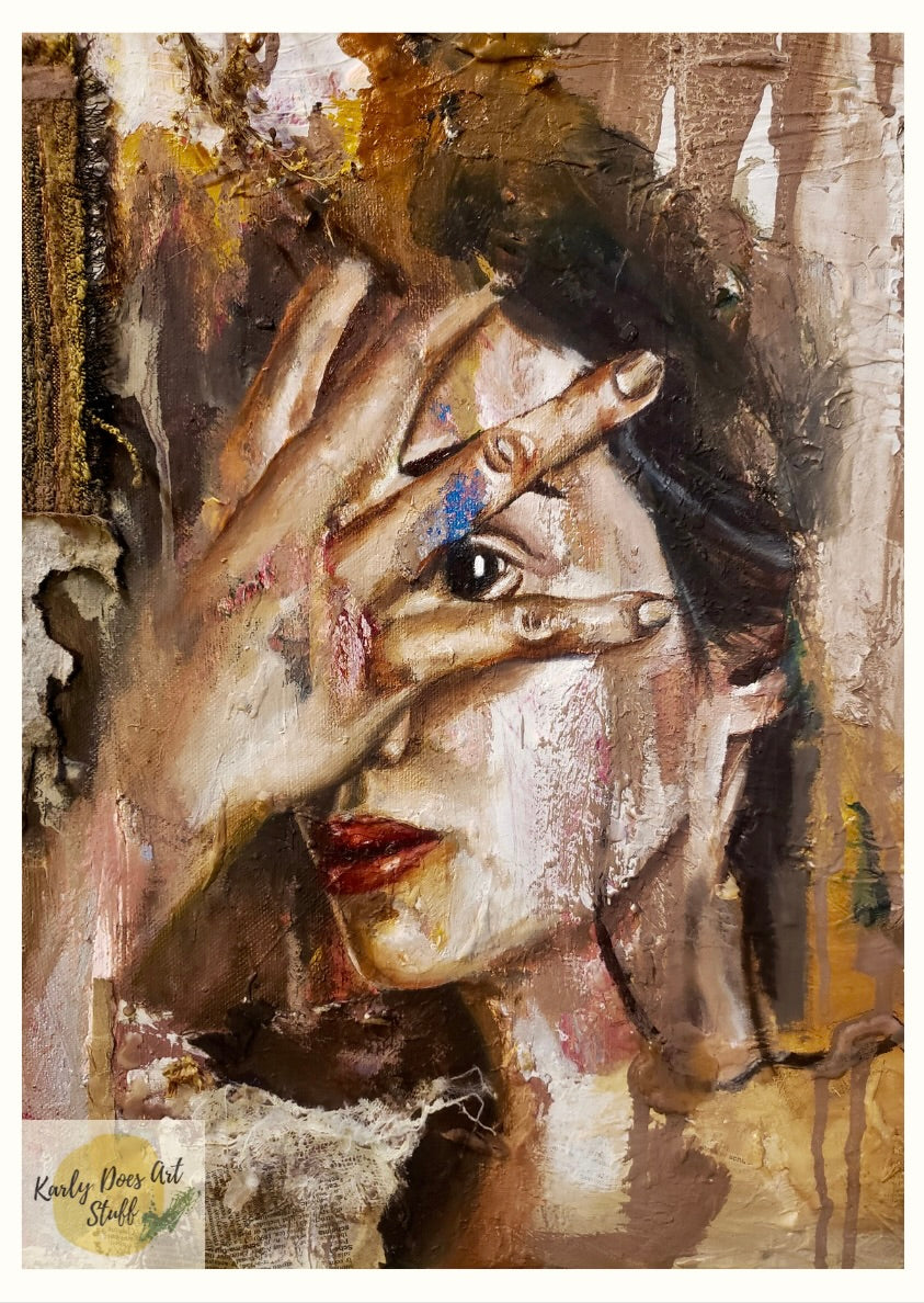 Il présente un portrait d'une femme et de sa main avec un arrière-plan abstrait.