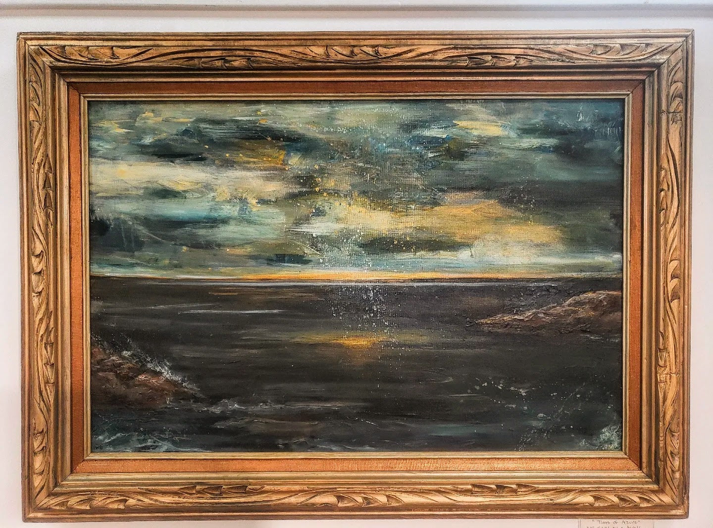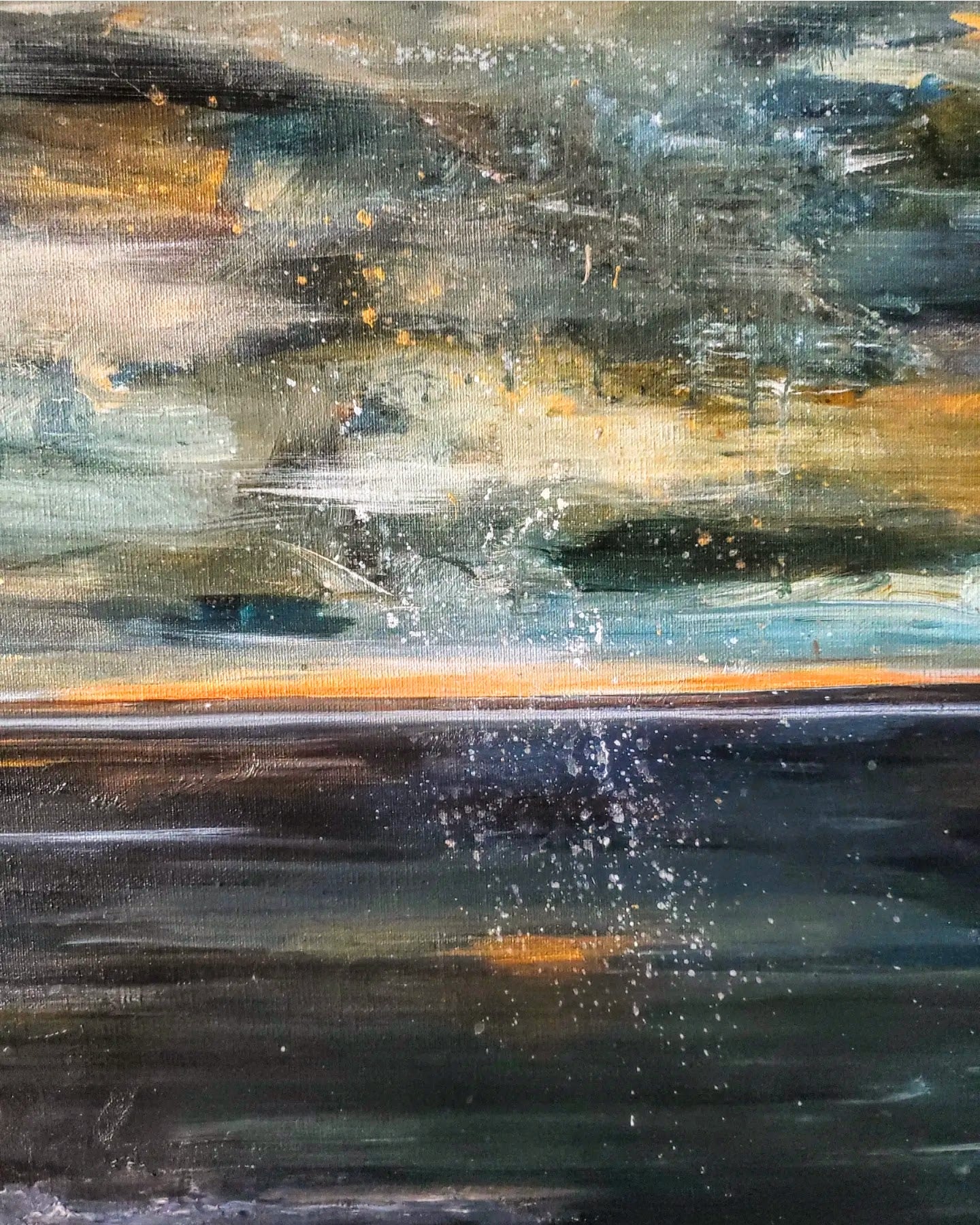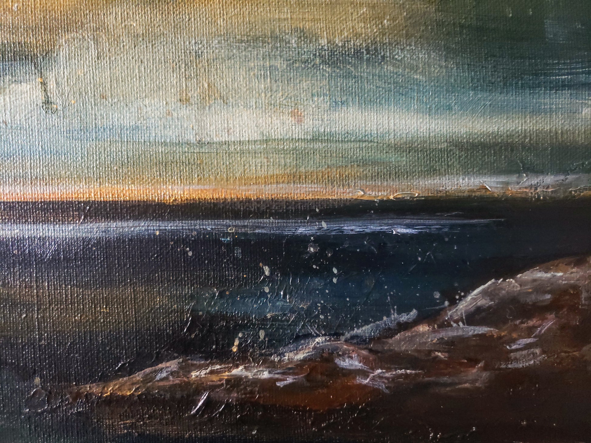 Mesurant 94 x 68 cm (cadre compris), ce paysage marin abstrait est réalisé à partir d'un mélange de peintures acryliques et à l'huile, créant un superbe mélange de bleus et d'or. Ajoutez cette œuvre à votre collection et apportez une touche de sérénité à n'importe quelle pièce.