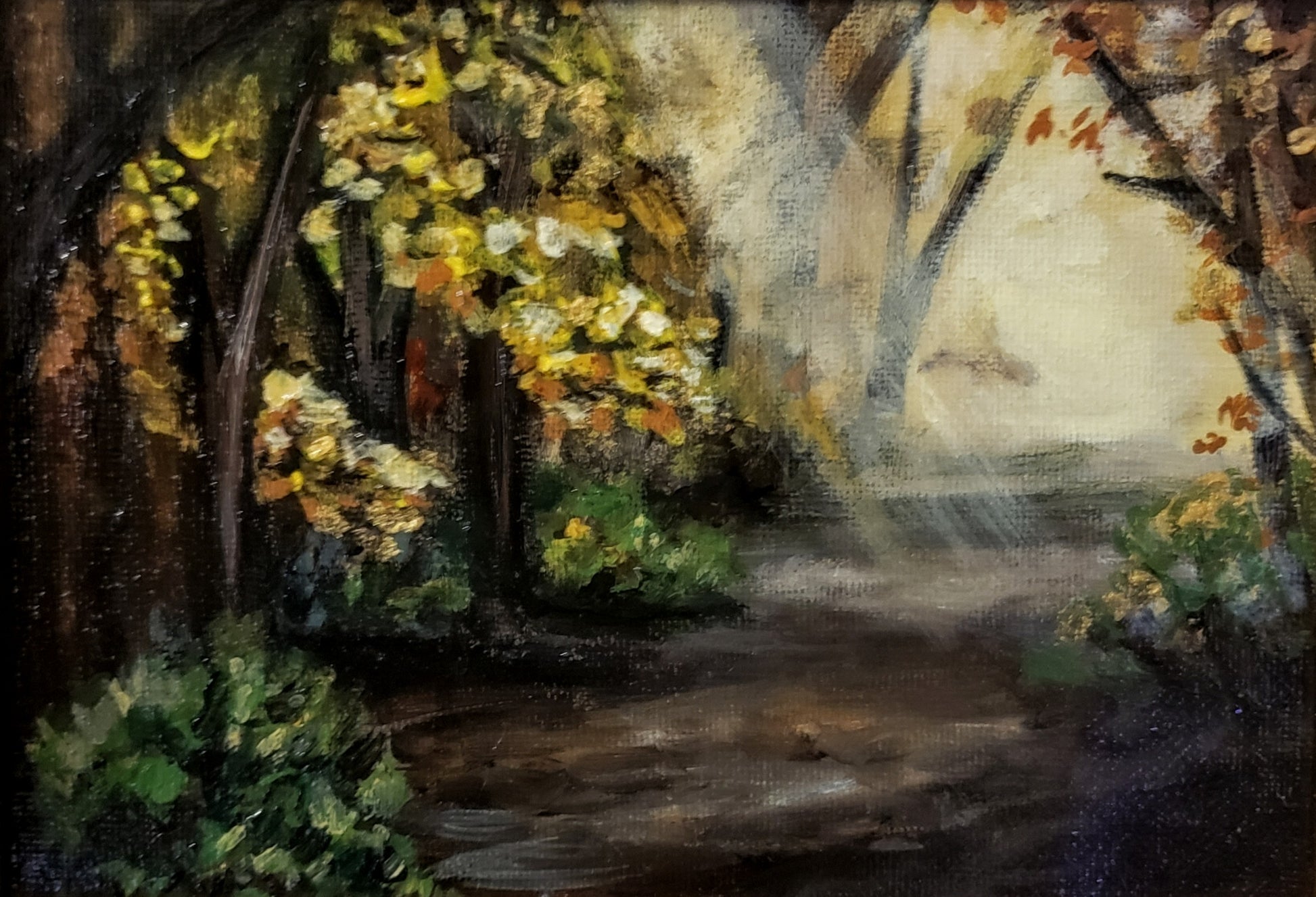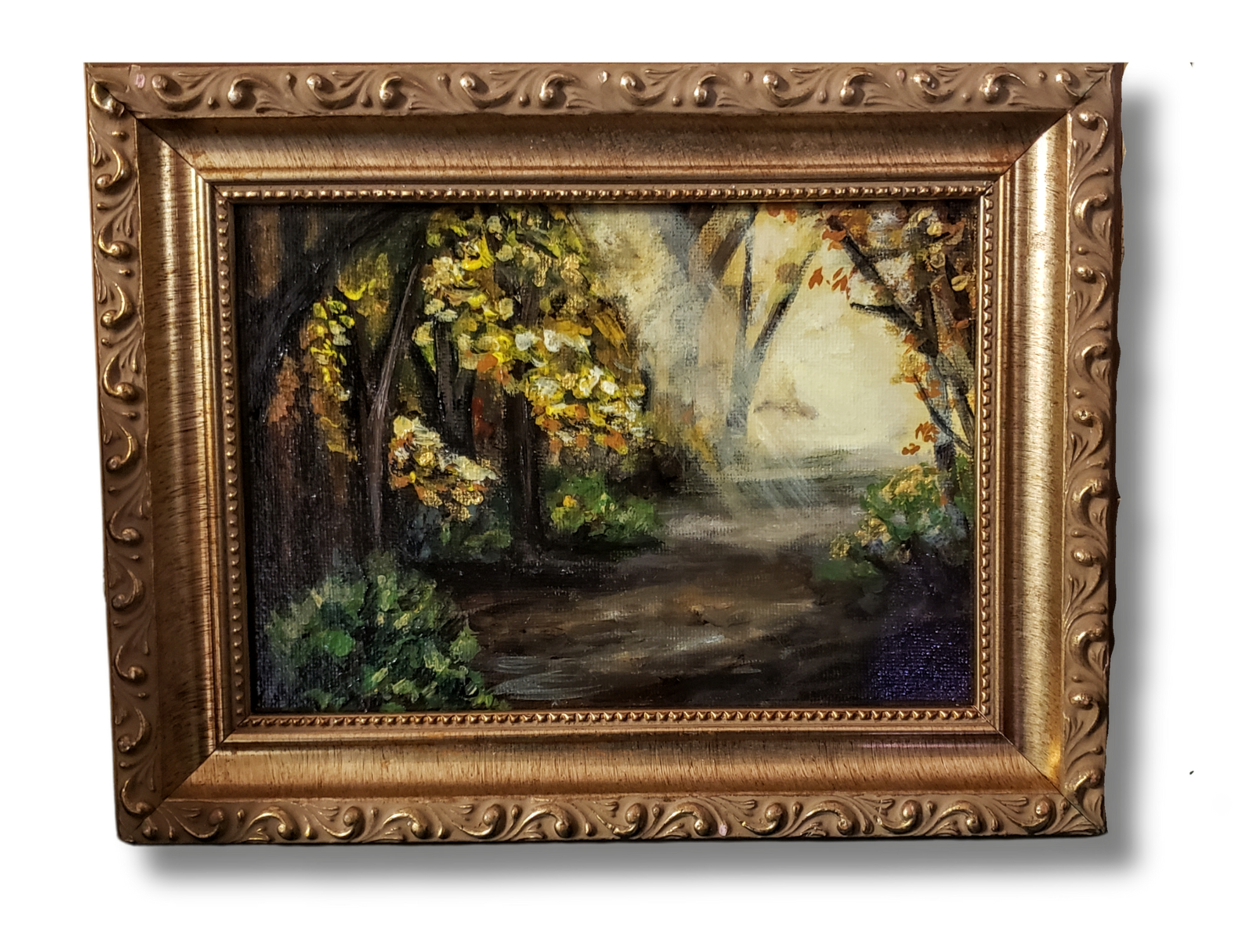 "Introducing "Beatrice", an acrylic and oil landscape inspired by the beloved animated show "Over the Garden Wall". This piece comes in a gold ornate frame, adding a touch of elegance and quirk to any room.