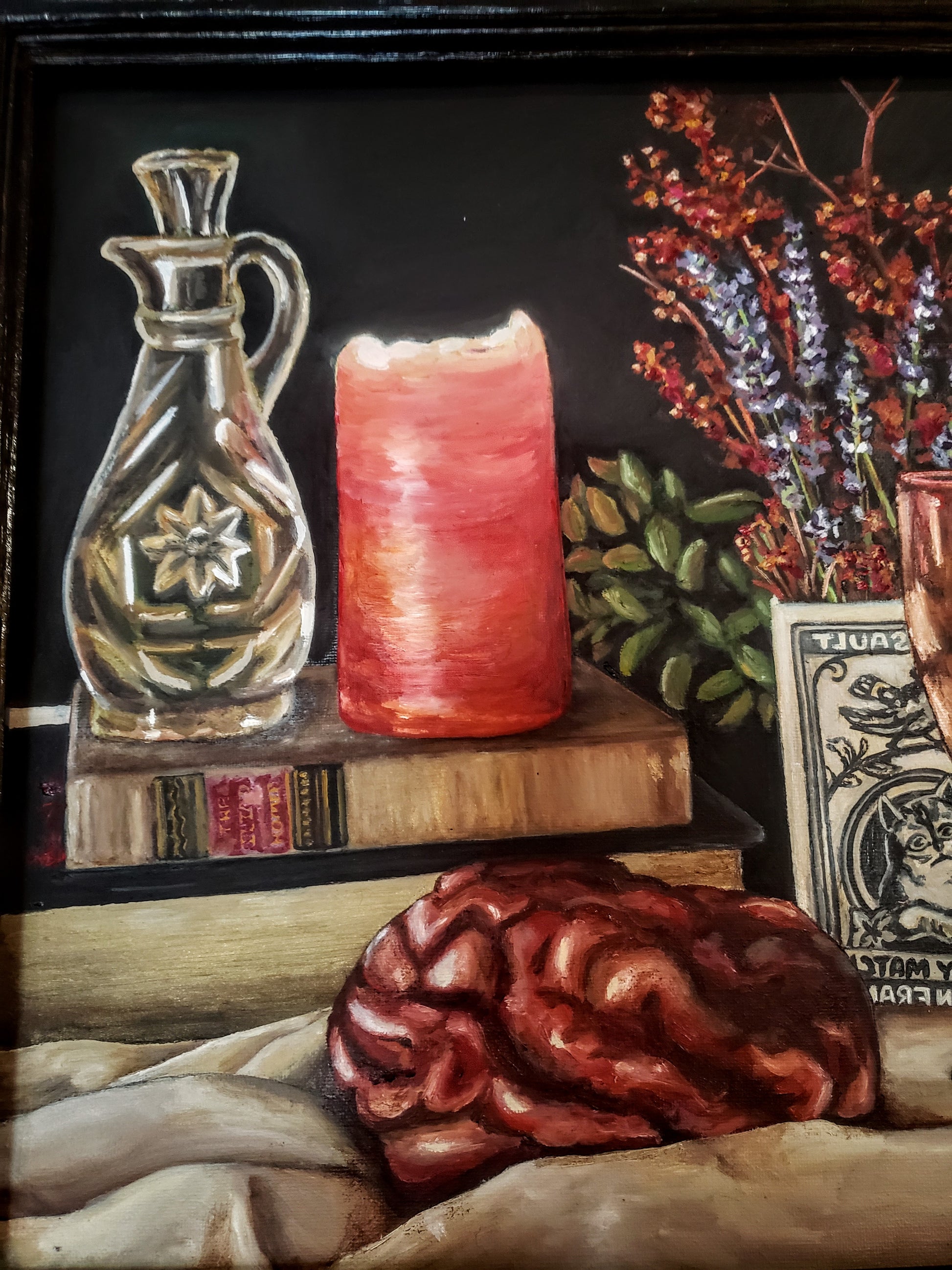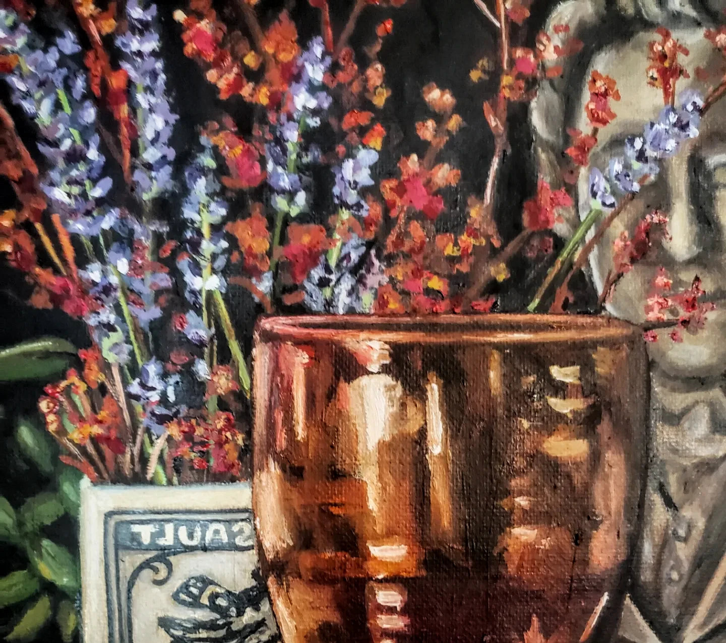 Experience the haunting beauty of "Danse Macabre", an original still-life oil painting.