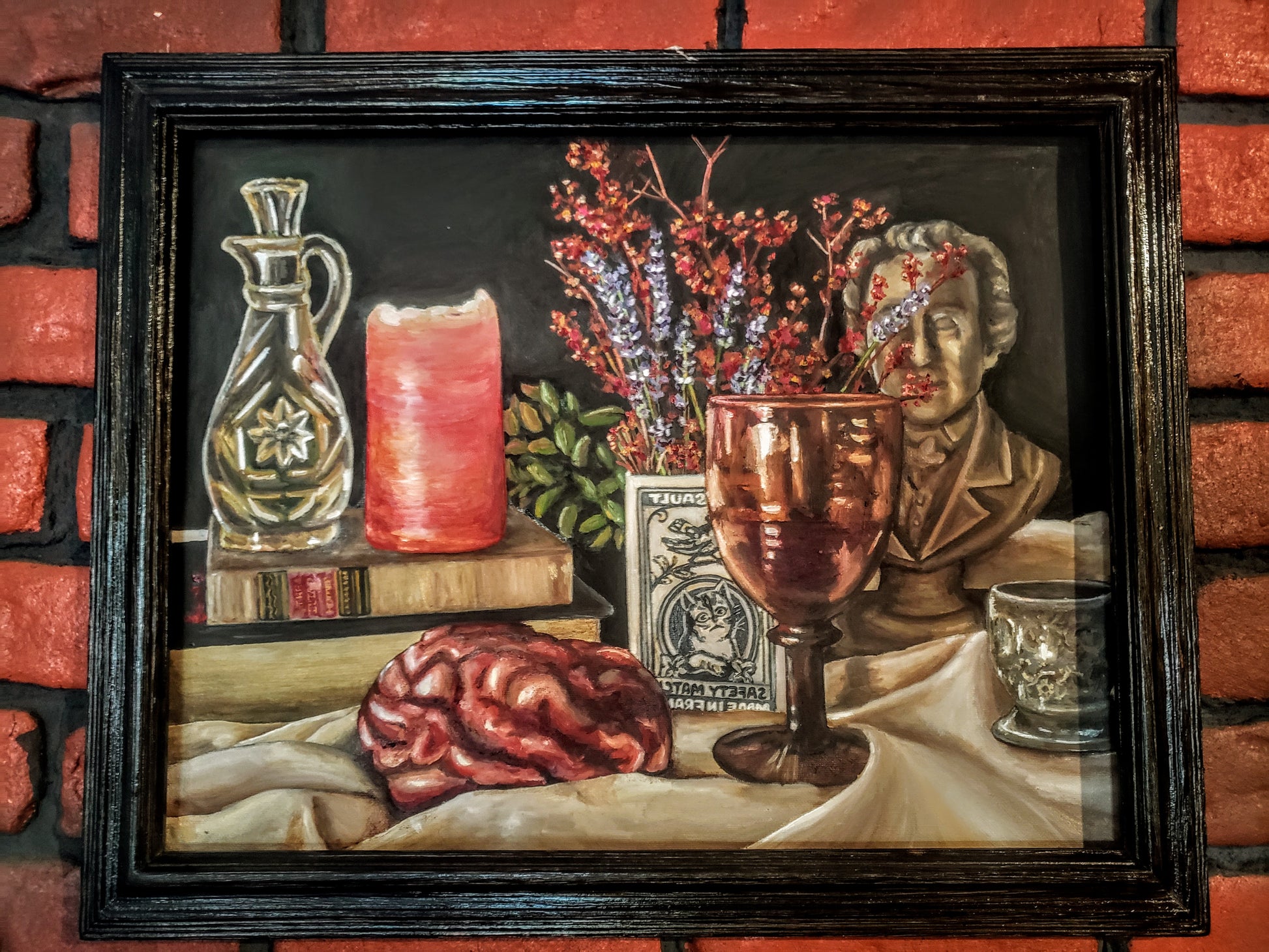 This piece features a bust of Edgar Allen Poe, along with books, a brain, and other macabre elements that will captivate any art lover. Add a touch of mystery to your decor today!