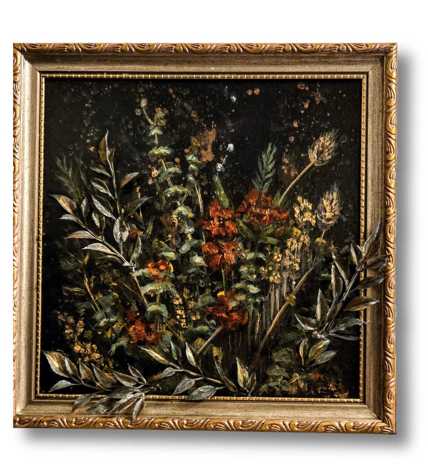 This mixed media painting, 12" x 12" in size, portrays a floral bouquet in an abstract form with a combination of red, green, and gold hues. The foliage elements add a three-dimensional aspect to the artwork. Enclosed within a sturdy gold frame.