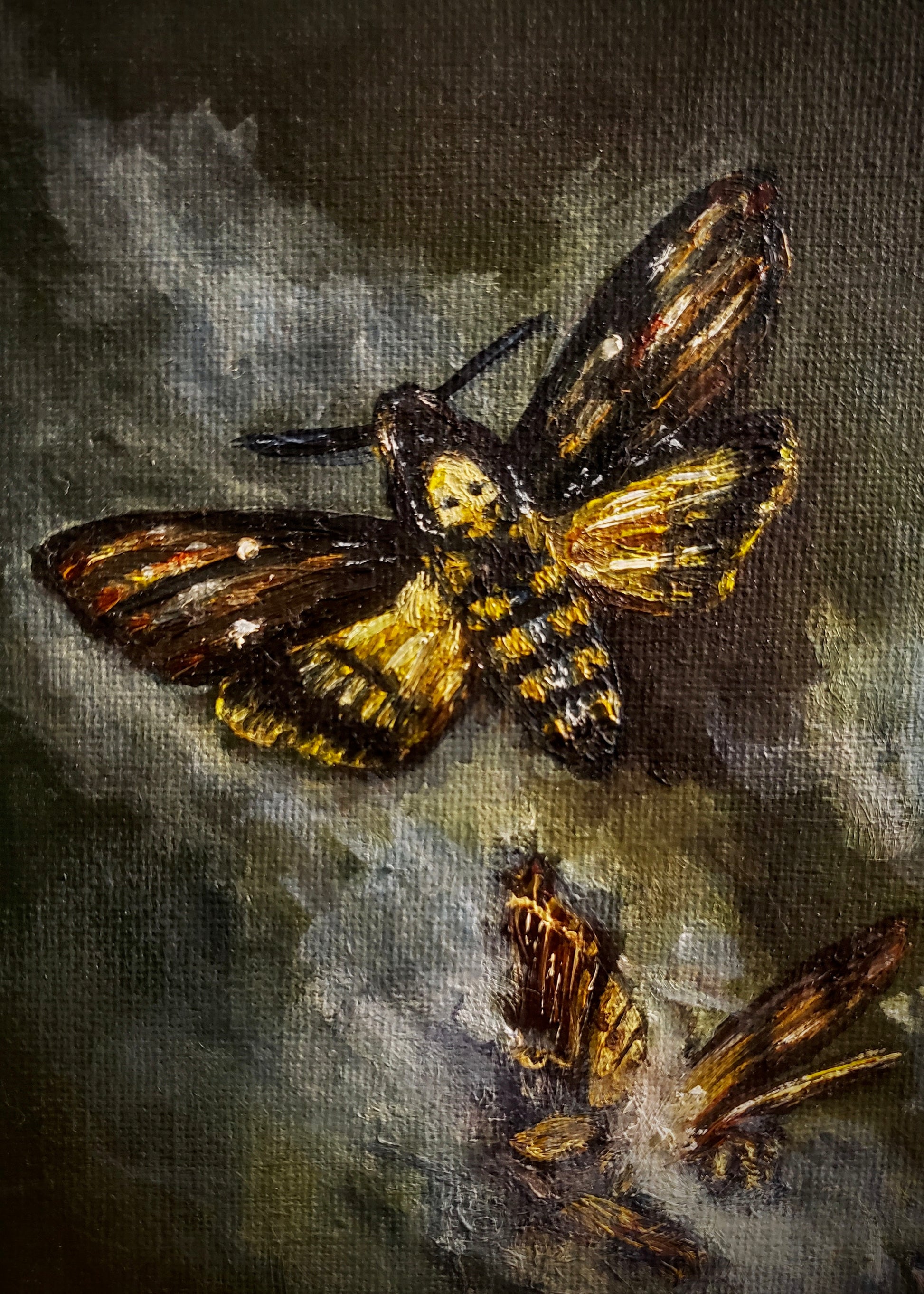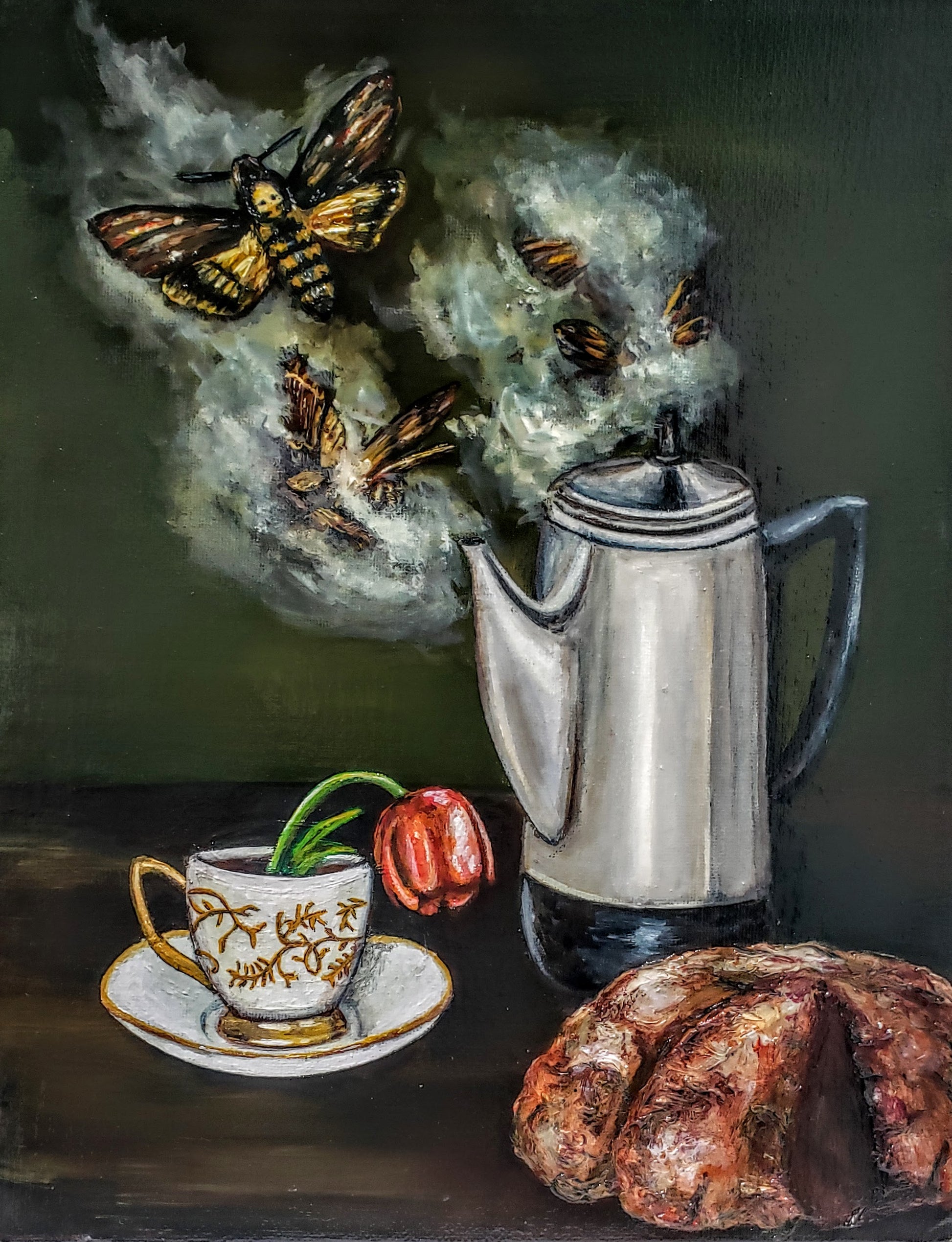 "For Fiona" is an original still-life oil painting inspired by the artistry of Fiona Apple. The piece incorporates death moths, a tulip in a teacup, and a brain, all painted in striking colors that create a hauntingly vivid image.