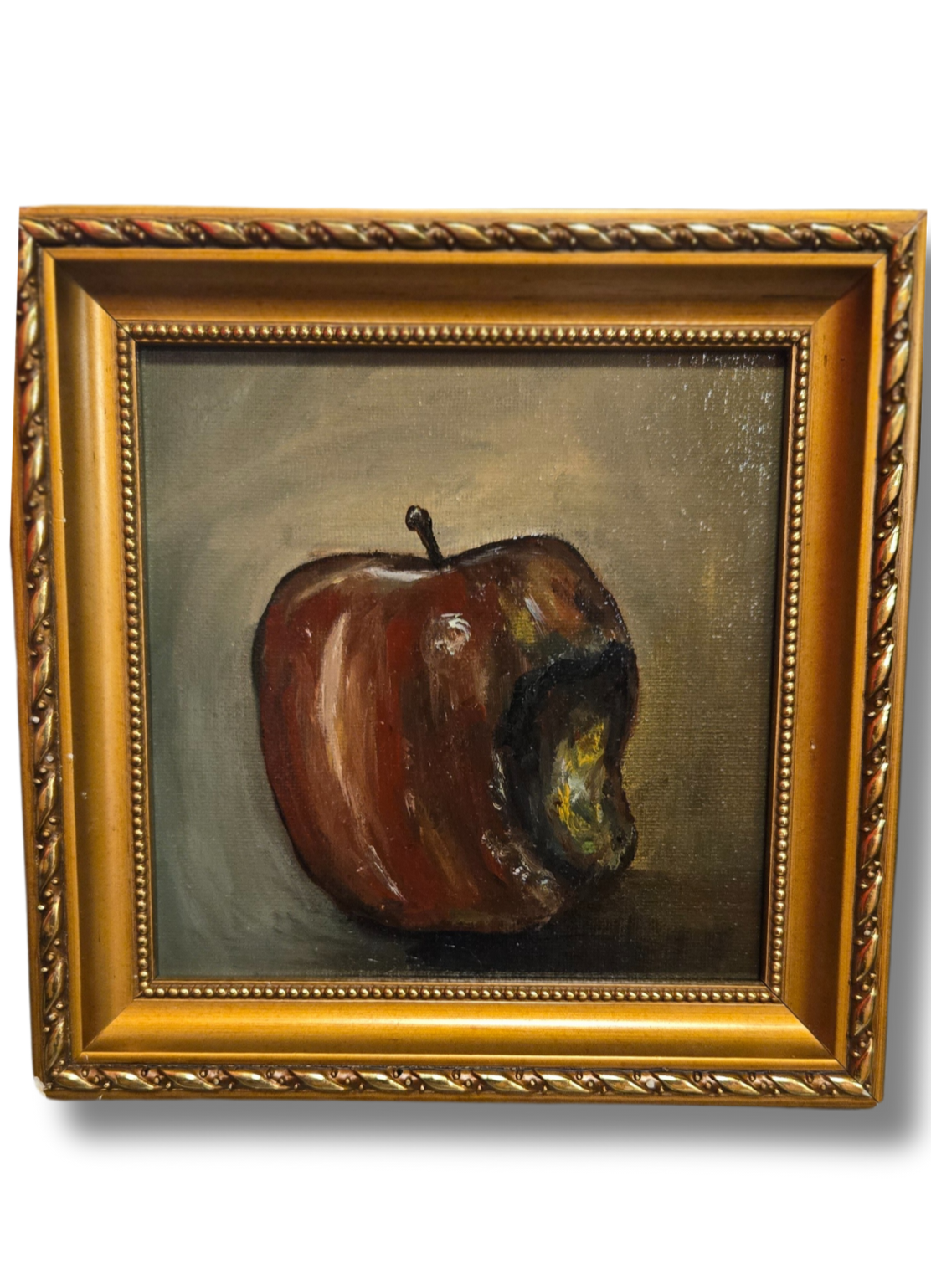 A must-have for any fan looking to showcase their love for the series of the same name, a still life pil painting, "Killing Eve". The red rotting apple, carefully encased in a gold ornate frame, measures 7" x 7" and beautifully embodies the show's alluring aesthetic.
