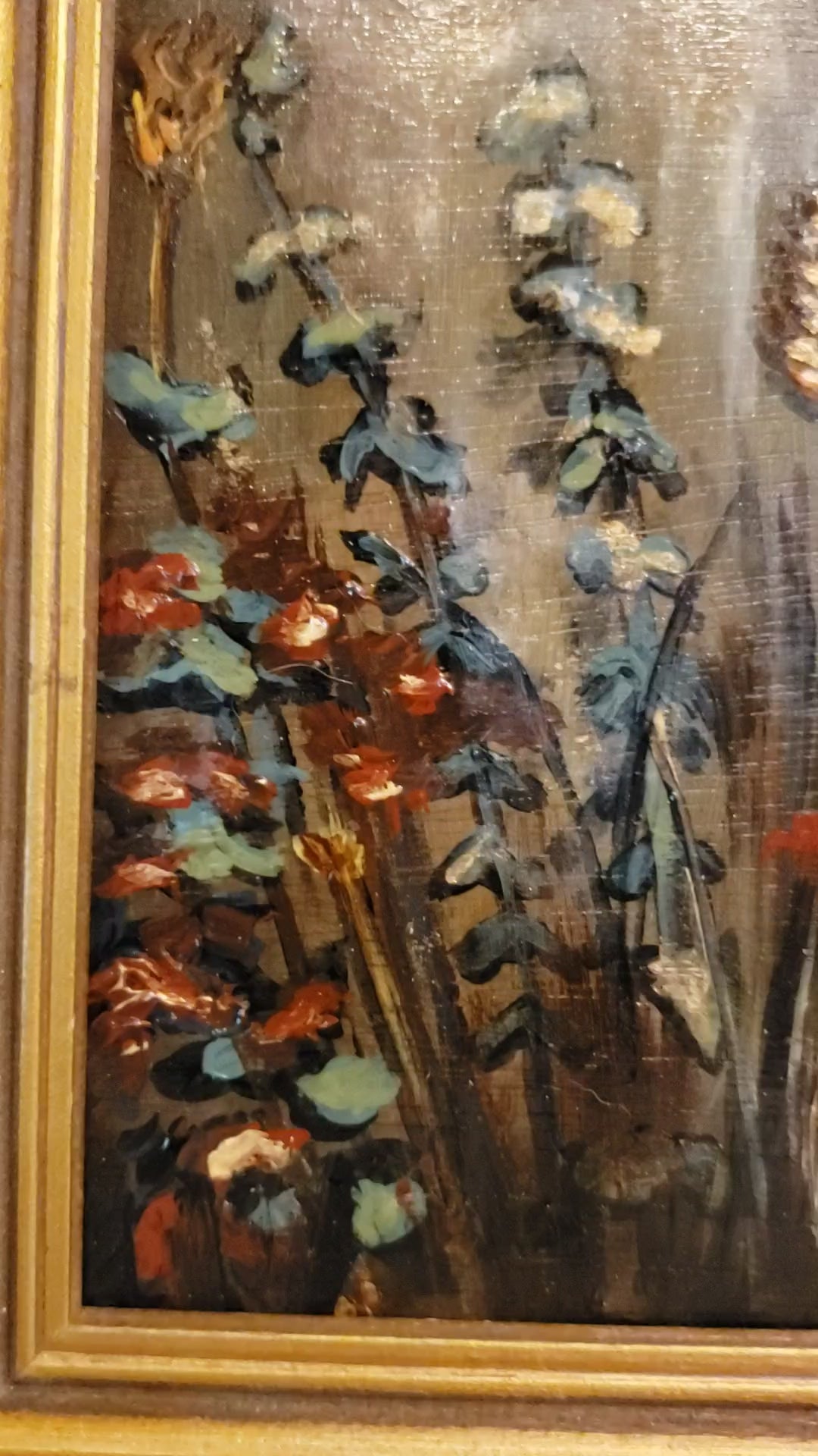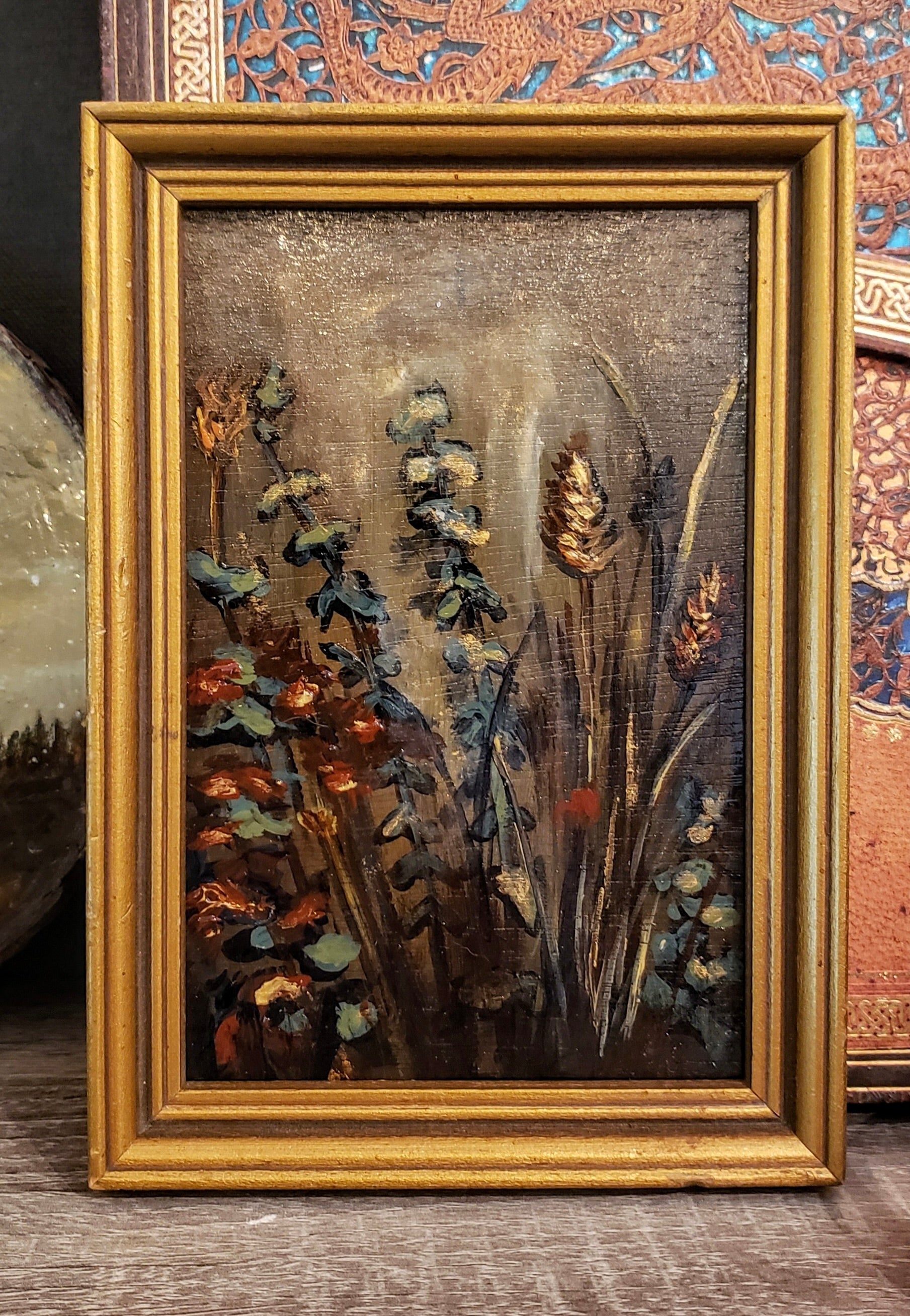 This artwork features a 4.75" x 6.75" oil and acrylic painting, depicting a collection of foliage in hues of gold, yellow, green, and red.