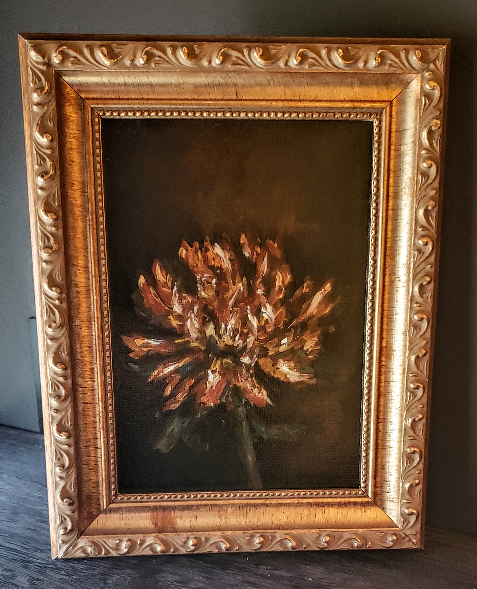 The piece comes with a gold frame for display. Made with oil and acrylic paint.