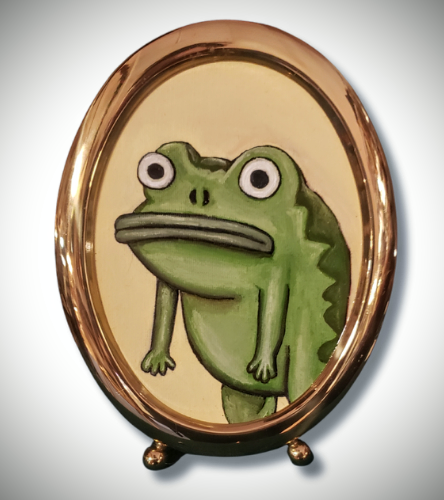 "Introducing "Wirt Jr.", an acrylic portrait inspired by the beloved animated show "Over the Garden Wall". This piece comes in a gold oval frame, adding a touch of elegance and quirk to any room.